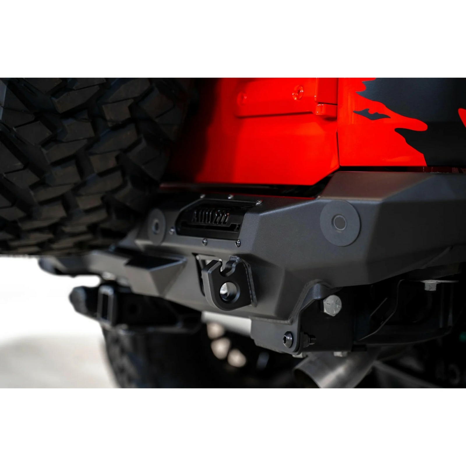 The Stealth Fighter Rear Bumper has a low-profile, modern plate steel design that stays tight to the rear of the Bronco. There are two mounting points for rear-facing cube lights, and an integrated license plate mount that also retains the license plate light. The bumper has cutouts for the OEM parking sensors, and for non-sensor Bronco models we provide plugs for the sensor holes. The Stealth Fighter was designed to fit above and around the OEM hitch and trailer plug.
