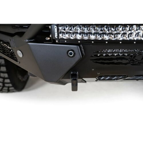 The HoneyBadger Raptor Front Bumper was designed to follow the body lines of the truck perfectly, while bringing a more aggressive edge to it’s stance. The steel is finished in a hammer black powder coat, while the aluminum panels are finished in a satin black powder coat. The powder coating protects your bumper from rust, and looks great doing it. If your 2021-2023 Raptor is equipped with the 801A High package, the front parking sensors can be installed seamlessly in the bumper. If your Raptor is equipped with the 800A Standard package, we supply sensor plugs with all shipments of this bumper that can be used to plug the mount holes. The OEM tow hooks fit perfectly underneath the bumper. As always, this bumper is fully bolt on and Made in America.