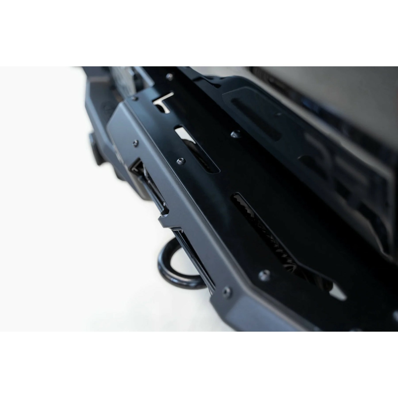 Not only does it look great, but it also retains full functionality of the important parking/backup warning system thanks to its sensor cutouts. The factory dual exhaust and tow hooks fit comfortably below the bumper. Additionally, you’ll find mounting points for two 10-inch SR LED light bars set behind satin black aluminum accent panels— perfect for illuminating any rugged terrain you may explore. And best of all, this bumper comes complete with all hardware, features a 100% bolt-on installation, and is Made in the USA!